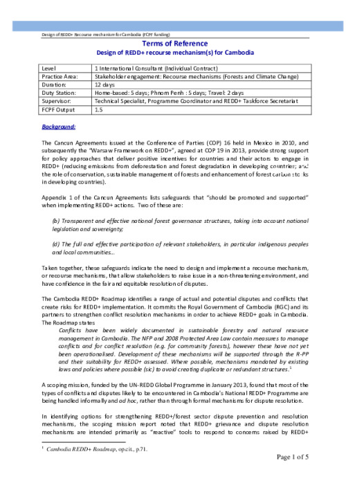 Home Document Library 1 5a TOR of International Consultant On Recourse Mechanisms 1 5a TOR of international consultant on recourse mechanisms Wed, 14 May, 2014 Download the resource Format: application/pdf Size: (0.397 MB) download Filed under: Category Empty Related publications View all Foundation documents 23 May, 2025UN-REDD Programme Developer 23/05/2025 - Document Download English 21 May, 2025UN-REDD Programme Draft UN-REDD 2026-2030 Strategy Download English 21 May, 2025UN-REDD Programme Draft Monitoring and Evaluation Framework UN-REDD 2026-30 Download English