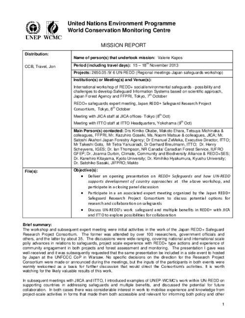 Home Document Library 131006-10 Kapos UN-REDD FFPRI Tokyo 131006-10 Kapos UN-REDD FFPRI Tokyo Fri, 31 Jan, 2014 Download the resource Format: application/pdf Size: (0.445 MB) download Filed under: Category Safeguards and Multiple Benefits mission reports Related publications View all Foundation documents 23 May, 2025UN-REDD Programme Developer 23/05/2025 - Document Download English 21 May, 2025UN-REDD Programme Draft UN-REDD 2026-2030 Strategy Download English 21 May, 2025UN-REDD Programme Draft Monitoring and Evaluation Framework UN-REDD 2026-30 Download English