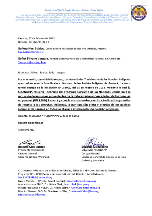 Home Document Library 2a. COONAPIP Communique of Withdrawal 31-13, Dated Feb 27 (Spanish Original) 2a. COONAPIP Communique of Withdrawal 31-13, dated Feb 27 (Spanish original) Tue, 02 Apr, 2013 Download the resource Format: application/pdf Size: (0.222 MB) download Filed under: Category Empty Related publications View all Foundation documents 23 May, 2025UN-REDD Programme Developer 23/05/2025 - Document Download English 21 May, 2025UN-REDD Programme Draft UN-REDD 2026-2030 Strategy Download English 21 May, 2025UN-REDD Programme Draft Monitoring and Evaluation Framework UN-REDD 2026-30 Download English