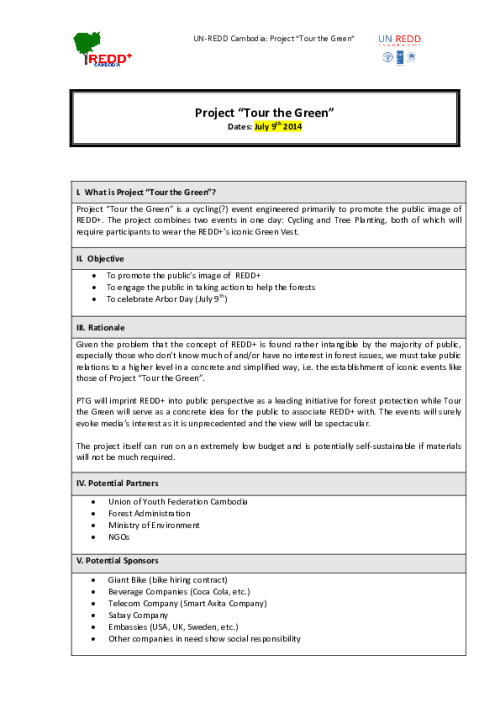 Home Document Library Act 1 4c Concept Note - Tour The Green-2014 Act 1 4c Concept Note - Tour the Green-2014 Thu, 08 May, 2014 Download the resource Format: application/pdf Size: (0.343 MB) download Filed under: Category Empty Related publications View all Foundation documents 23 May, 2025UN-REDD Programme Developer 23/05/2025 - Document Download English 21 May, 2025UN-REDD Programme Draft UN-REDD 2026-2030 Strategy Download English 21 May, 2025UN-REDD Programme Draft Monitoring and Evaluation Framework UN-REDD 2026-30 Download English