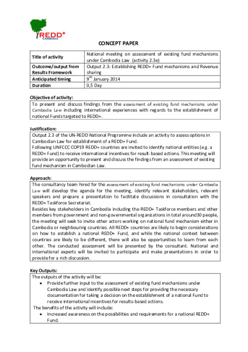 Home Document Library Act 2.3a Concept Note National REDD+ Fund Act 2.3a Concept Note National REDD+ Fund Thu, 08 May, 2014 Download the resource Format: application/pdf Size: (0.312 MB) download Filed under: Category Empty Related publications View all Foundation documents 23 May, 2025UN-REDD Programme Developer 23/05/2025 - Document Download English 21 May, 2025UN-REDD Programme Draft UN-REDD 2026-2030 Strategy Download English 21 May, 2025UN-REDD Programme Draft Monitoring and Evaluation Framework UN-REDD 2026-30 Download English
