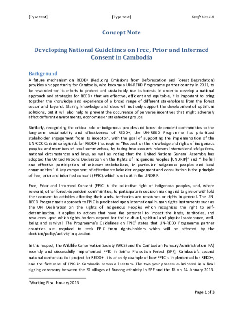 Home Document Library Act 2.6 Concept Note FPIC Guidelines Act 2.6 Concept Note FPIC Guidelines Thu, 08 May, 2014 Download the resource Format: application/pdf Size: (0.403 MB) download Filed under: Category Empty Related publications View all Foundation documents 23 May, 2025UN-REDD Programme Developer 23/05/2025 - Document Download English 21 May, 2025UN-REDD Programme Draft UN-REDD 2026-2030 Strategy Download English 21 May, 2025UN-REDD Programme Draft Monitoring and Evaluation Framework UN-REDD 2026-30 Download English