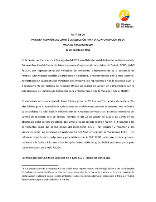 Home Document Library Acta de La Primera Reunión del Comité de Selección de La Mesa de Trabajo REDD+ 2012-08-24 Acta de la Primera Reunión del Comité de Selección de la Mesa de Trabajo REDD+ 2012-08-24 Thu, 13 Jun, 2013 Download the resource Format: application/pdf Size: (0.067 MB) download Filed under: Category Empty Related publications View all Foundation documents 23 May, 2025UN-REDD Programme Developer 23/05/2025 - Document Download English 21 May, 2025UN-REDD Programme Draft UN-REDD 2026-2030 Strategy Download English 21 May, 2025UN-REDD Programme Draft Monitoring and Evaluation Framework UN-REDD 2026-30 Download English