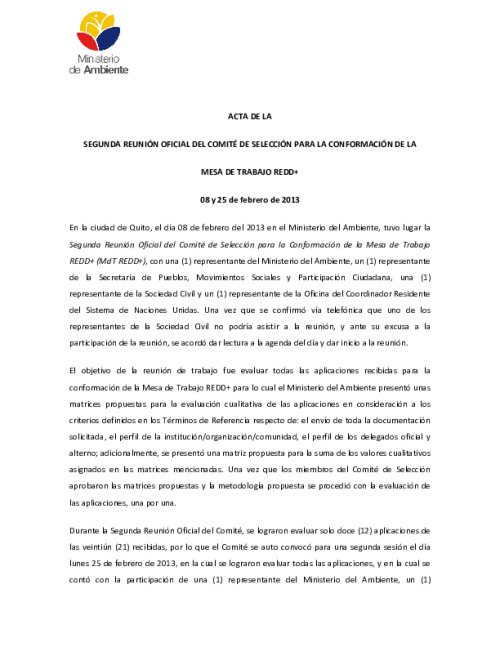 Home Document Library Acta de La Segunda y Tercera Reunión Oficial Comité de Selección 2013-02-26 Acta de la segunda y tercera reunión Oficial Comité de Selección 2013-02-26 Thu, 13 Jun, 2013 Download the resource Format: application/pdf Size: (0.45 MB) download Filed under: Category Empty Related publications View all Foundation documents 23 May, 2025UN-REDD Programme Developer 23/05/2025 - Document Download English 21 May, 2025UN-REDD Programme Draft UN-REDD 2026-2030 Strategy Download English 21 May, 2025UN-REDD Programme Draft Monitoring and Evaluation Framework UN-REDD 2026-30 Download English