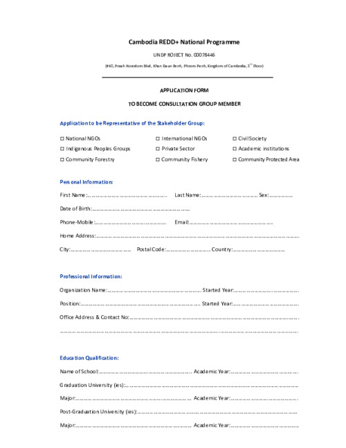 Home Document Library Application Form For Voluntary Stakeholders To Form REDD+ Consultation Group Application Form for Voluntary Stakeholders to Form REDD+ Consultation Group Mon, 27 May, 2013 Download the resource Format: application/pdf Size: (0.084 MB) download Filed under: Category Empty Related publications View all Foundation documents 23 May, 2025UN-REDD Programme Developer 23/05/2025 - Document Download English 21 May, 2025UN-REDD Programme Draft UN-REDD 2026-2030 Strategy Download English 21 May, 2025UN-REDD Programme Draft Monitoring and Evaluation Framework UN-REDD 2026-30 Download English
