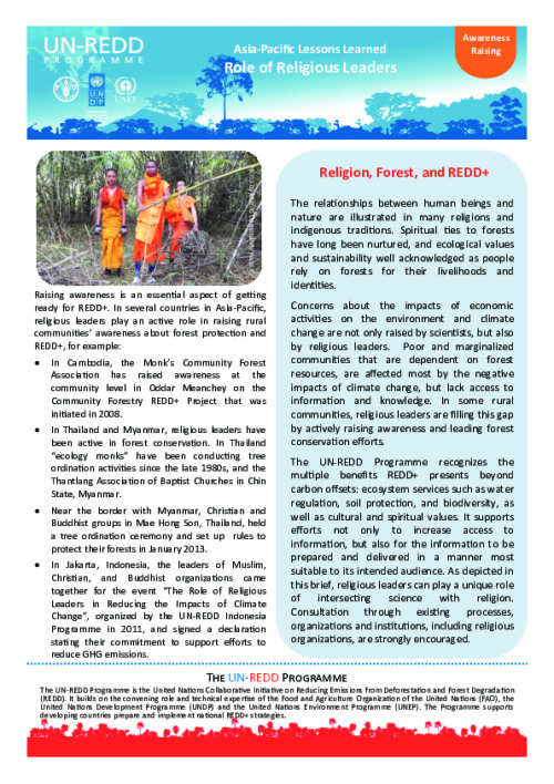 Home Document Library Asia-Pacific Lessons Learned: Role of Religious Leaders Asia-Pacific Lessons Learned: Role of Religious Leaders Wed, 24 Apr, 2013 Download the resource Format: application/pdf Size: (1.546 MB) download Filed under: Category Regional Lessons Learned Series Related publications View all Foundation documents 23 May, 2025UN-REDD Programme Developer 23/05/2025 - Document Download English 21 May, 2025UN-REDD Programme Draft UN-REDD 2026-2030 Strategy Download English 21 May, 2025UN-REDD Programme Draft Monitoring and Evaluation Framework UN-REDD 2026-30 Download English