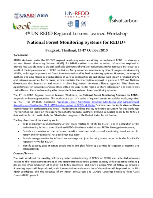 Concept note for 4th UN-REDD Regional Lessons Learned Workshop, on National Forest Monitoring Systems for REDD+. Bangkok, Thailand, 15-17 October 2013
