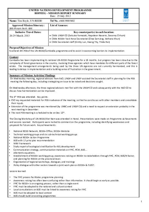 Home Document Library BTOR Boyle Cambodia Apr 2013 BTOR Boyle Cambodia Apr 2013 Mon, 20 Oct, 2014 Download the resource Format: application/pdf Size: (0.301 MB) download Filed under: Category Empty Related publications View all Foundation documents 23 May, 2025UN-REDD Programme Developer 23/05/2025 - Document Download English 21 May, 2025UN-REDD Programme Draft UN-REDD 2026-2030 Strategy Download English 21 May, 2025UN-REDD Programme Draft Monitoring and Evaluation Framework UN-REDD 2026-30 Download English