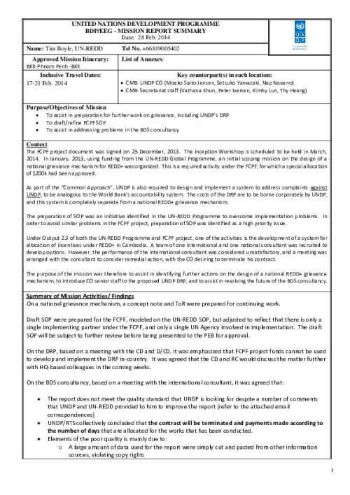 Home Document Library BTOR Boyle Cambodia Feb 2014 BTOR Boyle Cambodia Feb 2014 Mon, 20 Oct, 2014 Download the resource Format: application/pdf Size: (0.237 MB) download Filed under: Category Empty Related publications View all Foundation documents 23 May, 2025UN-REDD Programme Developer 23/05/2025 - Document Download English 21 May, 2025UN-REDD Programme Draft UN-REDD 2026-2030 Strategy Download English 21 May, 2025UN-REDD Programme Draft Monitoring and Evaluation Framework UN-REDD 2026-30 Download English