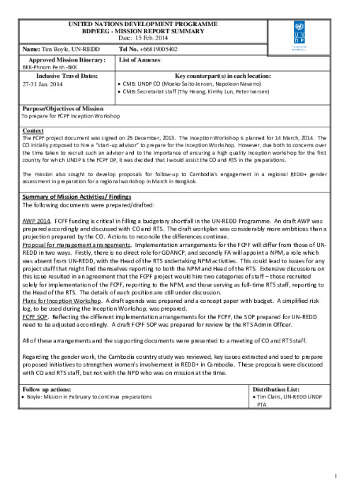 Home Document Library BTOR Boyle Cambodia Jan 2014 BTOR Boyle Cambodia Jan 2014 Mon, 20 Oct, 2014 Download the resource Format: application/pdf Size: (0.204 MB) download Filed under: Category Empty Related publications View all Foundation documents 23 May, 2025UN-REDD Programme Developer 23/05/2025 - Document Download English 21 May, 2025UN-REDD Programme Draft UN-REDD 2026-2030 Strategy Download English 21 May, 2025UN-REDD Programme Draft Monitoring and Evaluation Framework UN-REDD 2026-30 Download English