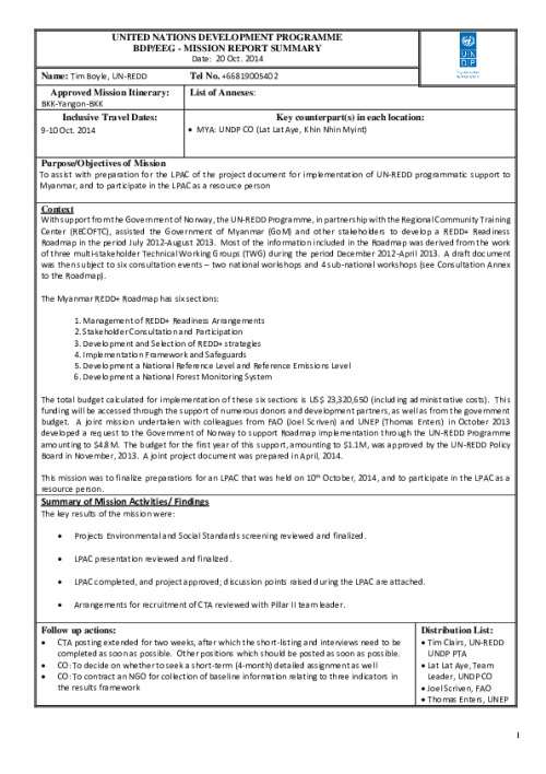 Home Document Library BTOR Boyle Myanmar Oct 2014 BTOR Boyle Myanmar Oct 2014 Mon, 20 Oct, 2014 Download the resource Format: application/pdf Size: (0.22 MB) download Filed under: Category Empty Related publications View all Foundation documents 23 May, 2025UN-REDD Programme Developer 23/05/2025 - Document Download English 21 May, 2025UN-REDD Programme Draft UN-REDD 2026-2030 Strategy Download English 21 May, 2025UN-REDD Programme Draft Monitoring and Evaluation Framework UN-REDD 2026-30 Download English