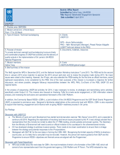 Home Document Library BTOR Celina March 2014 Sri Lanka BTOR Celina March 2014 Sri Lanka Thu, 03 Apr, 2014 Download the resource Format: application/pdf Size: (0.21 MB) download Filed under: Category Empty Related publications View all Foundation documents 23 May, 2025UN-REDD Programme Developer 23/05/2025 - Document Download English 21 May, 2025UN-REDD Programme Draft UN-REDD 2026-2030 Strategy Download English 21 May, 2025UN-REDD Programme Draft Monitoring and Evaluation Framework UN-REDD 2026-30 Download English