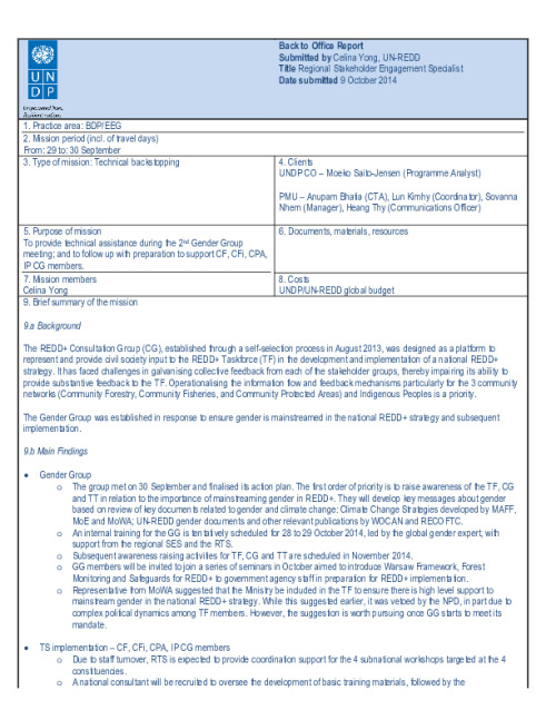 Home Document Library BTOR Celina_29-30 Sept 2014 Cambodia BTOR Celina_29-30 Sept 2014 Cambodia Thu, 09 Oct, 2014 Download the resource Format: application/pdf Size: (0.225 MB) download Filed under: Category Empty Related publications View all Foundation documents 23 May, 2025UN-REDD Programme Developer 23/05/2025 - Document Download English 21 May, 2025UN-REDD Programme Draft UN-REDD 2026-2030 Strategy Download English 21 May, 2025UN-REDD Programme Draft Monitoring and Evaluation Framework UN-REDD 2026-30 Download English