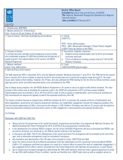 Home Document Library BTOR Celina_Aki Jan 2014 Sri Lanka_FINALdoc BTOR Celina_Aki Jan 2014 Sri Lanka_FINALdoc Thu, 20 Feb, 2014 Download the resource Format: application/pdf Size: (0.239 MB) download Filed under: Category Empty Related publications View all Foundation documents 23 May, 2025UN-REDD Programme Developer 23/05/2025 - Document Download English 21 May, 2025UN-REDD Programme Draft UN-REDD 2026-2030 Strategy Download English 21 May, 2025UN-REDD Programme Draft Monitoring and Evaluation Framework UN-REDD 2026-30 Download English