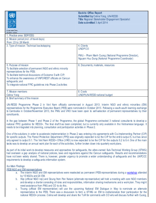 Home Document Library BTOR Celina_Mar 2014 Hanoi BTOR Celina_Mar 2014 Hanoi Thu, 03 Apr, 2014 Download the resource Format: application/pdf Size: (0.259 MB) download Filed under: Category Empty Related publications View all Foundation documents 23 May, 2025UN-REDD Programme Developer 23/05/2025 - Document Download English 21 May, 2025UN-REDD Programme Draft UN-REDD 2026-2030 Strategy Download English 21 May, 2025UN-REDD Programme Draft Monitoring and Evaluation Framework UN-REDD 2026-30 Download English