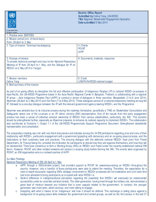Home Document Library BTOR Celina_May 2014 Yangon BTOR Celina_May 2014 Yangon Wed, 21 May, 2014 Download the resource Format: application/pdf Size: (0.207 MB) download Filed under: Category Empty Related publications View all Foundation documents 23 May, 2025UN-REDD Programme Developer 23/05/2025 - Document Download English 21 May, 2025UN-REDD Programme Draft UN-REDD 2026-2030 Strategy Download English 21 May, 2025UN-REDD Programme Draft Monitoring and Evaluation Framework UN-REDD 2026-30 Download English