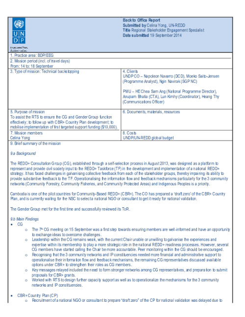 Home Document Library BTOR Celina_Sept 2014 Cambodia BTOR Celina_Sept 2014 Cambodia Fri, 19 Sep, 2014 Download the resource Format: application/pdf Size: (0.237 MB) download Filed under: Category Empty Related publications View all Foundation documents 23 May, 2025UN-REDD Programme Developer 23/05/2025 - Document Download English 21 May, 2025UN-REDD Programme Draft UN-REDD 2026-2030 Strategy Download English 21 May, 2025UN-REDD Programme Draft Monitoring and Evaluation Framework UN-REDD 2026-30 Download English