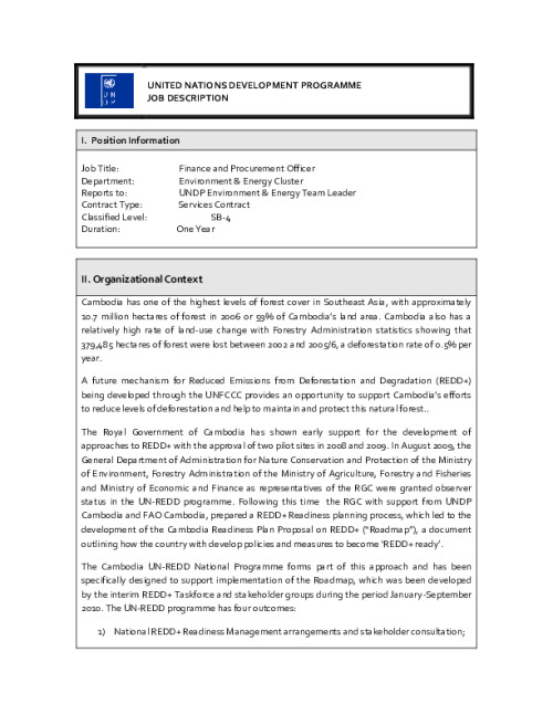 Home Document Library CAM OP 1.2 Finance Procurement Officer CAM OP 1.2 Finance Procurement Officer Tue, 19 Mar, 2013 Download the resource Format: application/pdf Size: (0.224 MB) download Filed under: Category Empty Related publications View all Foundation documents 23 May, 2025UN-REDD Programme Developer 23/05/2025 - Document Download English 21 May, 2025UN-REDD Programme Draft UN-REDD 2026-2030 Strategy Download English 21 May, 2025UN-REDD Programme Draft Monitoring and Evaluation Framework UN-REDD 2026-30 Download English