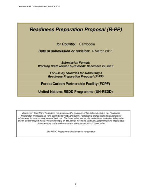 Home Document Library Cambodia R-PP (Final With Responses To PC) Cambodia R-PP (Final with responses to PC) Thu, 14 Mar, 2013 Download the resource Format: application/pdf Size: (2.382 MB) download Filed under: Category Empty Related publications View all Foundation documents 23 May, 2025UN-REDD Programme Developer 23/05/2025 - Document Download English 21 May, 2025UN-REDD Programme Draft UN-REDD 2026-2030 Strategy Download English 21 May, 2025UN-REDD Programme Draft Monitoring and Evaluation Framework UN-REDD 2026-30 Download English