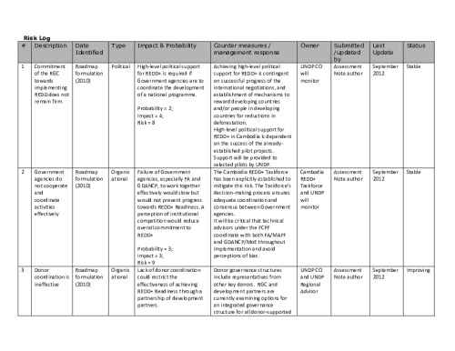 Home Document Library Cambodia RPP Risk Log Cambodia RPP risk log Wed, 14 May, 2014 Download the resource Format: application/pdf Size: (0.316 MB) download Filed under: Category Empty Related publications View all Foundation documents 23 May, 2025UN-REDD Programme Developer 23/05/2025 - Document Download English 21 May, 2025UN-REDD Programme Draft UN-REDD 2026-2030 Strategy Download English 21 May, 2025UN-REDD Programme Draft Monitoring and Evaluation Framework UN-REDD 2026-30 Download English