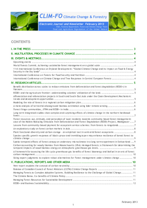 CLIM-FO-L is an e-newsletter on forests and climate change compiled by FAO, issued monthly. It provides information on recent developments in climate change negotiations, scientific articles, publications, events and job opportunities, among other things.The February 2013 issue (http://www.fao.org/forestry/68146/en/)provides the latest news, abstracts of scientific articles and publications related to forests and climate change.