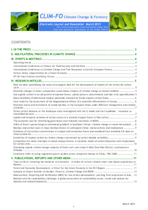 CLIM-FO-L is an e-newsletter on forests and climate change compiled by FAO, issued monthly. It provides information on recent developments in climate change negotiations, scientific articles, publications, events and job opportunities, among other things.The March 2013 issue provides the latest news, abstracts of scientific articles and publications related to forests and climate change.