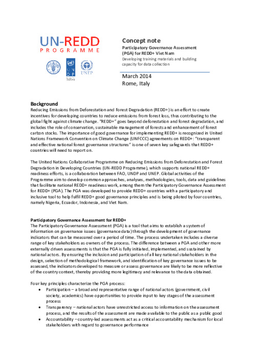 Home Document Library Concept Note -- Vietnam PGA Data Collection Manual and Training Concept Note -- Vietnam PGA Data Collection Manual and Training Thu, 10 Apr, 2014 Download the resource Format: application/pdf Size: (0.3 MB) download Filed under: Category Empty Related publications View all Foundation documents 23 May, 2025UN-REDD Programme Developer 23/05/2025 - Document Download English 21 May, 2025UN-REDD Programme Draft UN-REDD 2026-2030 Strategy Download English 21 May, 2025UN-REDD Programme Draft Monitoring and Evaluation Framework UN-REDD 2026-30 Download English