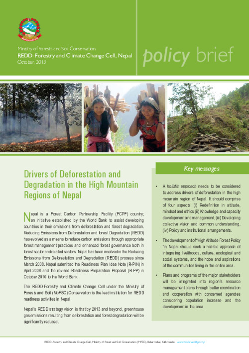 Home Document Library Drivers of Deforestation In HIgh Mountains Drivers of Deforestation in HIgh Mountains Fri, 13 Dec, 2013 Download the resource Format: application/pdf Size: (0.423 MB) download Filed under: Category Nepal Related publications View all Foundation documents 23 May, 2025UN-REDD Programme Developer 23/05/2025 - Document Download English 21 May, 2025UN-REDD Programme Draft UN-REDD 2026-2030 Strategy Download English 21 May, 2025UN-REDD Programme Draft Monitoring and Evaluation Framework UN-REDD 2026-30 Download English