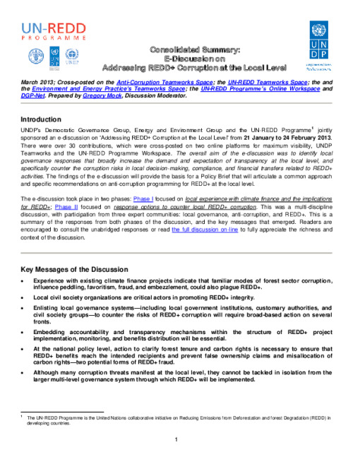 Home Document Library E-Discussion On Addressing REDD+ Corruption At Local Level _Consolidated Reply E-Discussion on Addressing REDD+ Corruption at Local Level _Consolidated Reply Wed, 17 Apr, 2013 Download the resource Format: application/pdf Size: (0.386 MB) download Filed under: Tags anti corruption discussion forum Category Empty Related publications View all Foundation documents 23 May, 2025UN-REDD Programme Developer 23/05/2025 - Document Download English 21 May, 2025UN-REDD Programme Draft UN-REDD 2026-2030 Strategy Download English 21 May, 2025UN-REDD Programme Draft Monitoring and Evaluation Framework UN-REDD 2026-30 Download English
