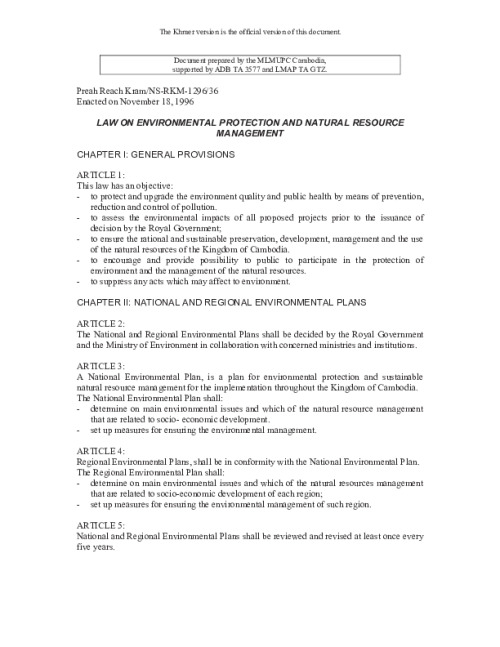 Home Document Library Environmental Protection of Nature Resource Management Law 1996 (ENG) Environmental Protection of Nature Resource Management Law 1996 (ENG) Thu, 24 Oct, 2013 Download the resource Format: application/pdf Size: (0.093 MB) download Filed under: Category Empty Related publications View all Foundation documents 23 May, 2025UN-REDD Programme Developer 23/05/2025 - Document Download English 21 May, 2025UN-REDD Programme Draft UN-REDD 2026-2030 Strategy Download English 21 May, 2025UN-REDD Programme Draft Monitoring and Evaluation Framework UN-REDD 2026-30 Download English