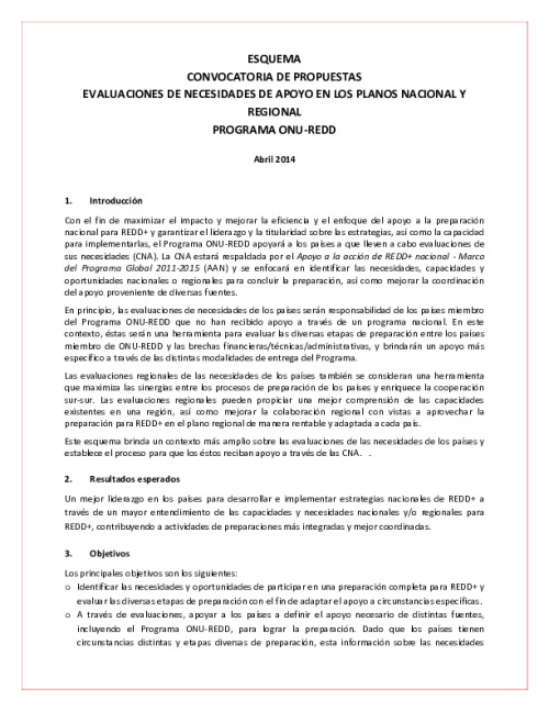 Home Document Library Esquema: Convocatoria de Propuestas: Evaluaciones de Necesidades de Apoyo En Los Planos Nacional y Regional Esquema: Convocatoria de Propuestas: Evaluaciones de necesidades de apoyo en los planos nacional y regional Wed, 24 Sep, 2014 Download the resource Format: application/pdf Size: (0.367 MB) download Filed under: Category Empty Related publications View all Foundation documents 23 May, 2025UN-REDD Programme Developer 23/05/2025 - Document Download English 21 May, 2025UN-REDD Programme Draft UN-REDD 2026-2030 Strategy Download English 21 May, 2025UN-REDD Programme Draft Monitoring and Evaluation Framework UN-REDD 2026-30 Download English