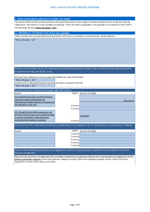 Home Document Library FCPF Country Progress Cambodia April 2014 FCPF Country Progress Cambodia April 2014 Wed, 14 May, 2014 Download the resource Format: application/pdf Size: (0.342 MB) download Filed under: Category Empty Related publications View all Foundation documents 23 May, 2025UN-REDD Programme Developer 23/05/2025 - Document Download English 21 May, 2025UN-REDD Programme Draft UN-REDD 2026-2030 Strategy Download English 21 May, 2025UN-REDD Programme Draft Monitoring and Evaluation Framework UN-REDD 2026-30 Download English