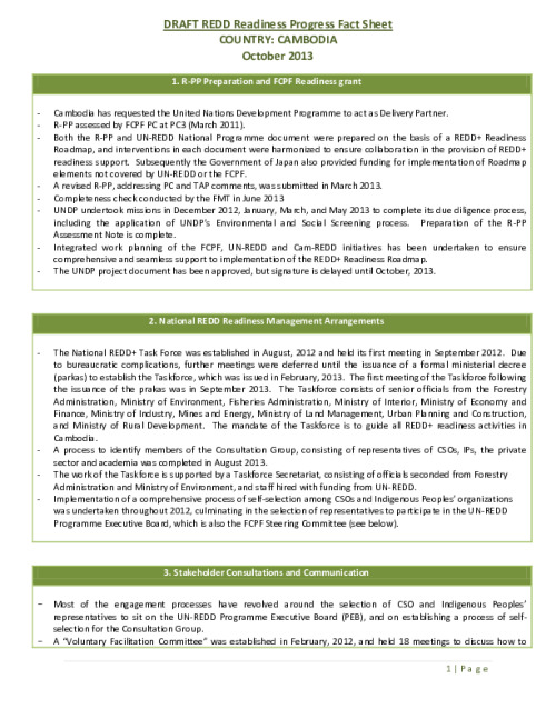 Home Document Library FCPF Readiness Progress Sheet - Cambodia FCPF Readiness Progress Sheet - Cambodia Fri, 07 Feb, 2014 Download the resource Format: application/pdf Size: (0.228 MB) download Filed under: Category Empty Related publications View all Foundation documents 23 May, 2025UN-REDD Programme Developer 23/05/2025 - Document Download English 21 May, 2025UN-REDD Programme Draft UN-REDD 2026-2030 Strategy Download English 21 May, 2025UN-REDD Programme Draft Monitoring and Evaluation Framework UN-REDD 2026-30 Download English