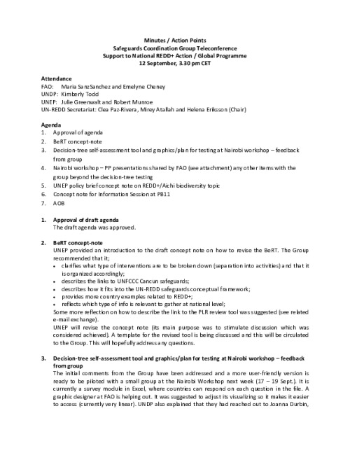 Home Document Library Final Minutes Safeguards Coord Group Conf Call_12 Sept 2013 (UN-REDD Secretariat) Final Minutes Safeguards Coord Group Conf Call_12 Sept 2013 (UN-REDD Secretariat) Wed, 12 Feb, 2014 Download the resource Format: application/pdf Size: (0.331 MB) download Filed under: Category Empty Related publications View all Foundation documents 23 May, 2025UN-REDD Programme Developer 23/05/2025 - Document Download English 21 May, 2025UN-REDD Programme Draft UN-REDD 2026-2030 Strategy Download English 21 May, 2025UN-REDD Programme Draft Monitoring and Evaluation Framework UN-REDD 2026-30 Download English