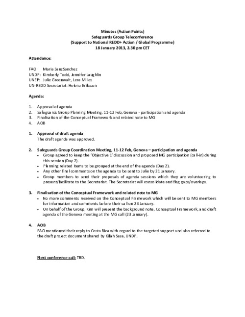Home Document Library Final Minutes Safeguards Group Telephone Conf 18 January 2013 (UN-REDD Secretariat) Final Minutes Safeguards Group Telephone Conf 18 January 2013 (UN-REDD Secretariat) Wed, 12 Feb, 2014 Download the resource Format: application/pdf Size: (0.306 MB) download Filed under: Category Empty Related publications View all Foundation documents 23 May, 2025UN-REDD Programme Developer 23/05/2025 - Document Download English 21 May, 2025UN-REDD Programme Draft UN-REDD 2026-2030 Strategy Download English 21 May, 2025UN-REDD Programme Draft Monitoring and Evaluation Framework UN-REDD 2026-30 Download English