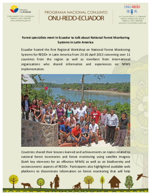 Home Document Library Forest Specialists Meet In Ecuador To Talk About National Forest Monitoring Systems In Latin America Forest specialists meet in Ecuador to talk about National Forest Monitoring Systems in Latin America Wed, 15 May, 2013 Download the resource Format: application/pdf Size: (0.556 MB) download Filed under: Category Public presentations and communications Related publications View all Foundation documents 23 May, 2025UN-REDD Programme Developer 23/05/2025 - Document Download English 21 May, 2025UN-REDD Programme Draft UN-REDD 2026-2030 Strategy Download English 21 May, 2025UN-REDD Programme Draft Monitoring and Evaluation Framework UN-REDD 2026-30 Download English