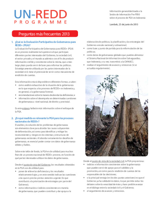 Home Document Library Frequently Asked Questions PGA June 2013 (Spanish Version) Frequently Asked Questions PGA June 2013 (Spanish version) Tue, 16 Jul, 2013 Download the resource Format: application/pdf Size: (0.274 MB) download Filed under: Category Empty Related publications View all Foundation documents 23 May, 2025UN-REDD Programme Developer 23/05/2025 - Document Download English 21 May, 2025UN-REDD Programme Draft UN-REDD 2026-2030 Strategy Download English 21 May, 2025UN-REDD Programme Draft Monitoring and Evaluation Framework UN-REDD 2026-30 Download English