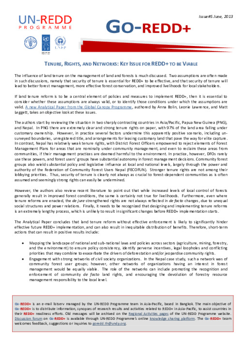 Home Document Library Go-REDD+_29 Tenure Rights and Networks Go-REDD+_29 Tenure rights and networks Tue, 04 Jun, 2013 Download the resource Format: application/pdf Size: (0.321 MB) download Filed under: Category Empty Related publications View all Foundation documents 23 May, 2025UN-REDD Programme Developer 23/05/2025 - Document Download English 21 May, 2025UN-REDD Programme Draft UN-REDD 2026-2030 Strategy Download English 21 May, 2025UN-REDD Programme Draft Monitoring and Evaluation Framework UN-REDD 2026-30 Download English