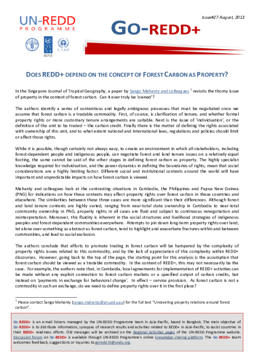 Home Document Library Go-REDD+_33 Carbon As Property Go-REDD+_33 Carbon as property Mon, 26 Aug, 2013 Download the resource Format: application/pdf Size: (0.308 MB) download Filed under: Category Empty Related publications View all Foundation documents 23 May, 2025UN-REDD Programme Developer 23/05/2025 - Document Download English 21 May, 2025UN-REDD Programme Draft UN-REDD 2026-2030 Strategy Download English 21 May, 2025UN-REDD Programme Draft Monitoring and Evaluation Framework UN-REDD 2026-30 Download English