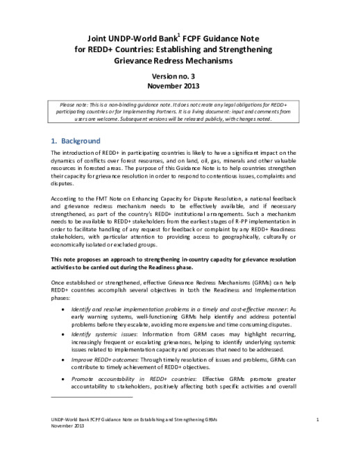 Home Document Library Guidance Note On National Grievance Mechanisms (DRAFT) Guidance Note on National Grievance Mechanisms (DRAFT) Sun, 08 Dec, 2013 Download the resource Format: application/pdf Size: (0.719 MB) download Filed under: Category Empty Related publications View all Foundation documents 23 May, 2025UN-REDD Programme Developer 23/05/2025 - Document Download English 21 May, 2025UN-REDD Programme Draft UN-REDD 2026-2030 Strategy Download English 21 May, 2025UN-REDD Programme Draft Monitoring and Evaluation Framework UN-REDD 2026-30 Download English