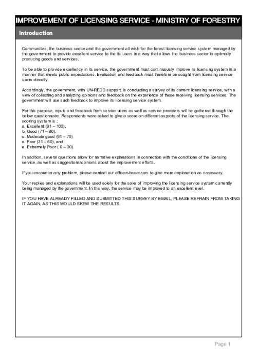 Home Document Library Indonesia Survey On Improving Forest Licensing Services - English Version Indonesia Survey on Improving Forest Licensing Services - English version Mon, 21 Jul, 2014 Download the resource Format: application/pdf Size: (0.352 MB) download Filed under: Tags Indonesia questionnaire Targeted support anti corruption 2014 licensing Category Empty Related publications View all Foundation documents 23 May, 2025UN-REDD Programme Developer 23/05/2025 - Document Download English 21 May, 2025UN-REDD Programme Draft UN-REDD 2026-2030 Strategy Download English 21 May, 2025UN-REDD Programme Draft Monitoring and Evaluation Framework UN-REDD 2026-30 Download English