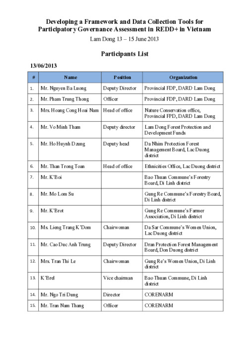 Home Document Library List of Participants Attended Ws 13 - 15/6/2013 List of participants attended ws 13 - 15/6/2013 Thu, 20 Jun, 2013 Download the resource Format: application/pdf Size: (0.104 MB) download Filed under: Category Empty Related publications View all Foundation documents 23 May, 2025UN-REDD Programme Developer 23/05/2025 - Document Download English 21 May, 2025UN-REDD Programme Draft UN-REDD 2026-2030 Strategy Download English 21 May, 2025UN-REDD Programme Draft Monitoring and Evaluation Framework UN-REDD 2026-30 Download English