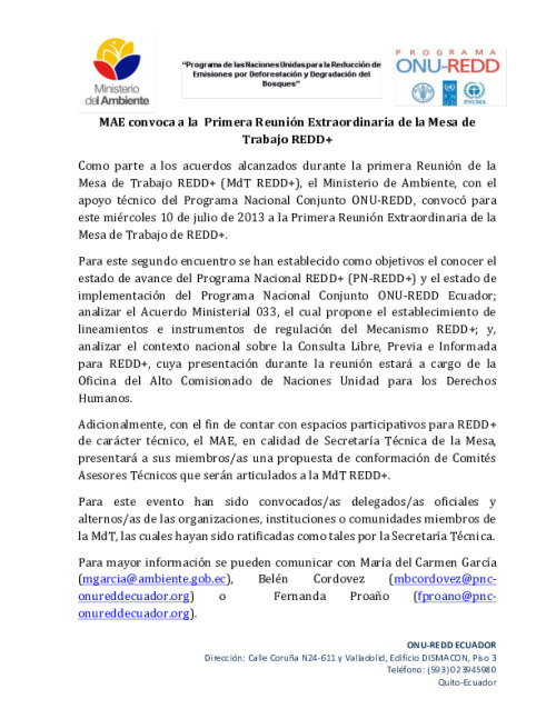 Home Document Library MAE Convoca a La Primera Reunión Extraordinaria de La Mesa de Trabajo REDD+ MAE convoca a la Primera Reunión Extraordinaria de la Mesa de Trabajo REDD+ Tue, 09 Jul, 2013 Download the resource Format: application/pdf Size: (0.094 MB) download Filed under: Category Empty Related publications View all Foundation documents 23 May, 2025UN-REDD Programme Developer 23/05/2025 - Document Download English 21 May, 2025UN-REDD Programme Draft UN-REDD 2026-2030 Strategy Download English 21 May, 2025UN-REDD Programme Draft Monitoring and Evaluation Framework UN-REDD 2026-30 Download English