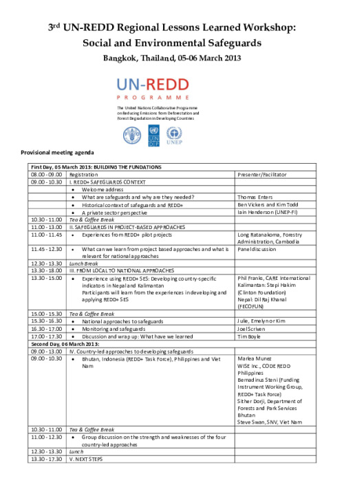 Meeting agenda - 3rd UN-REDD Regional Lessons Learned Workshop: Social and Environment Safeguards Bangkok, Thailand, 5-6 March, 2013