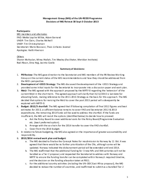 Home Document Library MG Minutes Retreat 30 Sept-3 Oct 2013 MG minutes Retreat 30 Sept-3 Oct 2013 Tue, 11 Nov, 2014 Download the resource Format: application/pdf Size: (0.128 MB) download Filed under: Category Empty Related publications View all Foundation documents 23 May, 2025UN-REDD Programme Developer 23/05/2025 - Document Download English 21 May, 2025UN-REDD Programme Draft UN-REDD 2026-2030 Strategy Download English 21 May, 2025UN-REDD Programme Draft Monitoring and Evaluation Framework UN-REDD 2026-30 Download English
