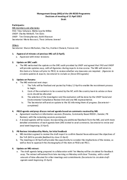 Home Document Library MG_Minutes 11 Apr 2013 Rev MG_Minutes 11 Apr 2013 rev Thu, 18 Apr, 2013 Download the resource Format: application/pdf Size: (0.422 MB) download Filed under: Category Empty Related publications View all Foundation documents 23 May, 2025UN-REDD Programme Developer 23/05/2025 - Document Download English 21 May, 2025UN-REDD Programme Draft UN-REDD 2026-2030 Strategy Download English 21 May, 2025UN-REDD Programme Draft Monitoring and Evaluation Framework UN-REDD 2026-30 Download English