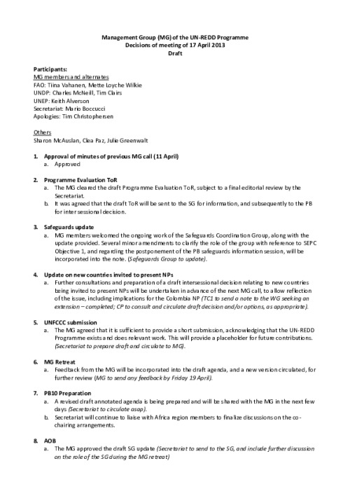 Home Document Library MG_Minutes 17 Apr 2013 MG_Minutes 17 Apr 2013 Fri, 26 Apr, 2013 Download the resource Format: application/pdf Size: (0.34 MB) download Filed under: Category Empty Related publications View all Foundation documents 23 May, 2025UN-REDD Programme Developer 23/05/2025 - Document Download English 21 May, 2025UN-REDD Programme Draft UN-REDD 2026-2030 Strategy Download English 21 May, 2025UN-REDD Programme Draft Monitoring and Evaluation Framework UN-REDD 2026-30 Download English