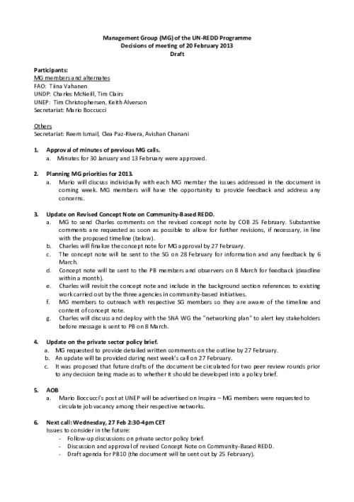 Home Document Library MG_Minutes 20 Feb 2013 MG_Minutes 20 Feb 2013 Thu, 28 Feb, 2013 Download the resource Format: application/pdf Size: (0.267 MB) download Filed under: Category Empty Related publications View all Foundation documents 23 May, 2025UN-REDD Programme Developer 23/05/2025 - Document Download English 21 May, 2025UN-REDD Programme Draft UN-REDD 2026-2030 Strategy Download English 21 May, 2025UN-REDD Programme Draft Monitoring and Evaluation Framework UN-REDD 2026-30 Download English