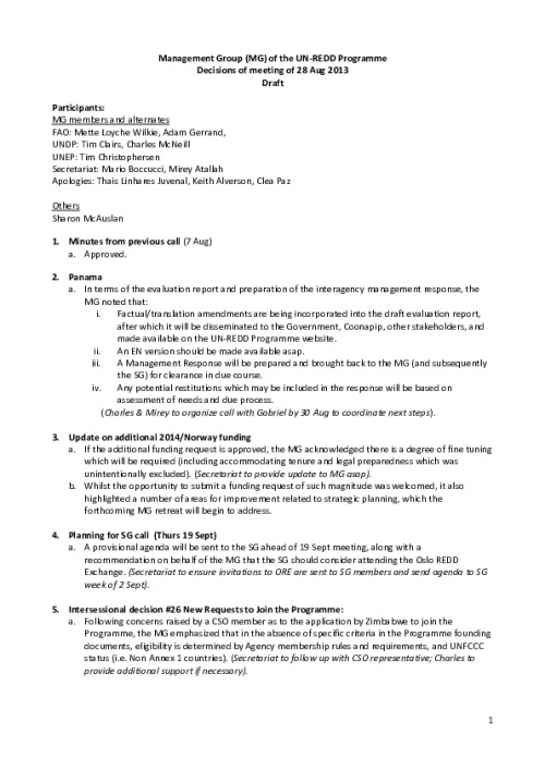 Home Document Library MG_Minutes 28 Aug 2013 MG_Minutes 28 Aug 2013 Mon, 23 Sep, 2013 Download the resource Format: application/pdf Size: (0.353 MB) download Filed under: Category Empty Related publications View all Foundation documents 23 May, 2025UN-REDD Programme Developer 23/05/2025 - Document Download English 21 May, 2025UN-REDD Programme Draft UN-REDD 2026-2030 Strategy Download English 21 May, 2025UN-REDD Programme Draft Monitoring and Evaluation Framework UN-REDD 2026-30 Download English