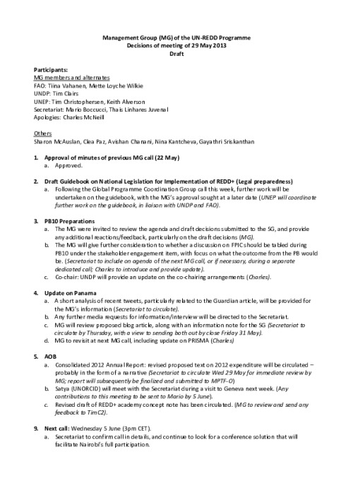 Home Document Library MG_Minutes 29 May 2013 MG_Minutes 29 May 2013 Wed, 05 Jun, 2013 Download the resource Format: application/pdf Size: (0.349 MB) download Filed under: Category Empty Related publications View all Foundation documents 23 May, 2025UN-REDD Programme Developer 23/05/2025 - Document Download English 21 May, 2025UN-REDD Programme Draft UN-REDD 2026-2030 Strategy Download English 21 May, 2025UN-REDD Programme Draft Monitoring and Evaluation Framework UN-REDD 2026-30 Download English